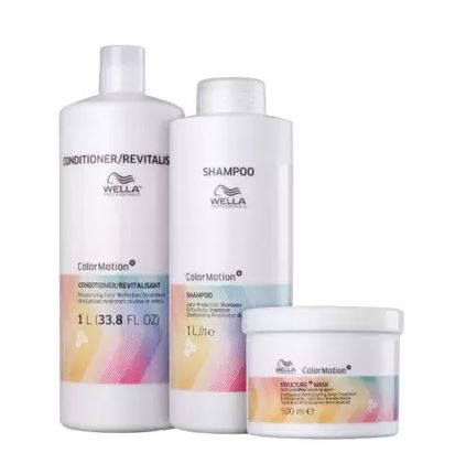 Kit com shampoo, condicionador e máscara para cabelos coloridos e danificados. Kit Wella Professionals Color Motion+ Salon Trio é ideal para proteção da cor e força.